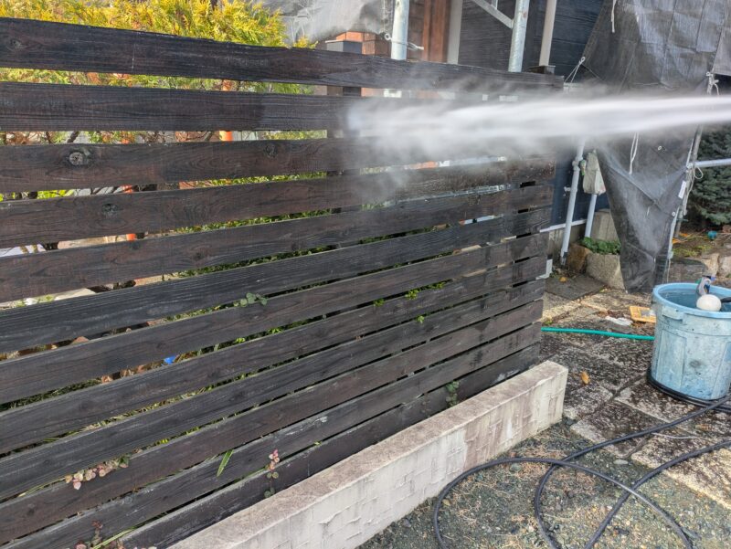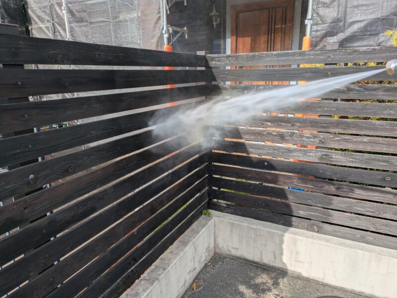 本日はお客様に外柵高圧洗浄を頼まれたので洗浄を行いその後にビニール養生です。