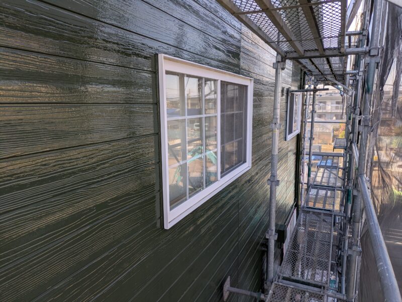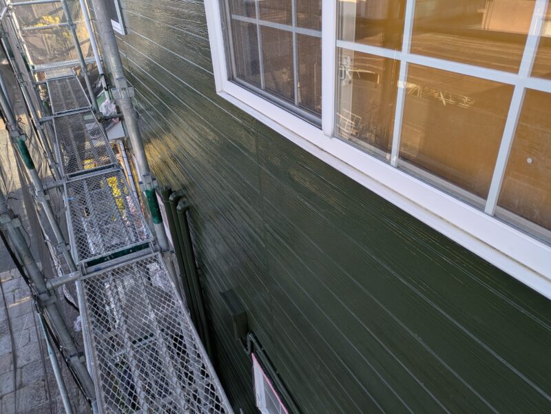 本日は外壁の上塗り塗装を行い、その後養生を撤去しました。