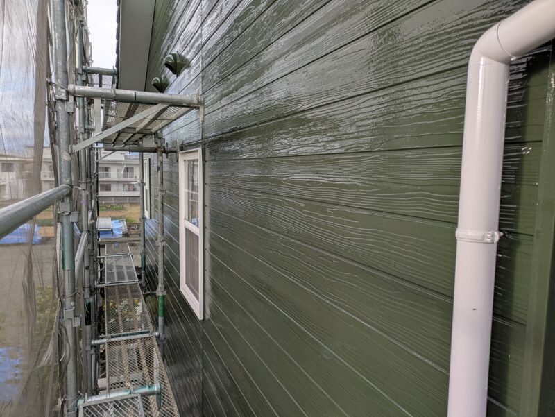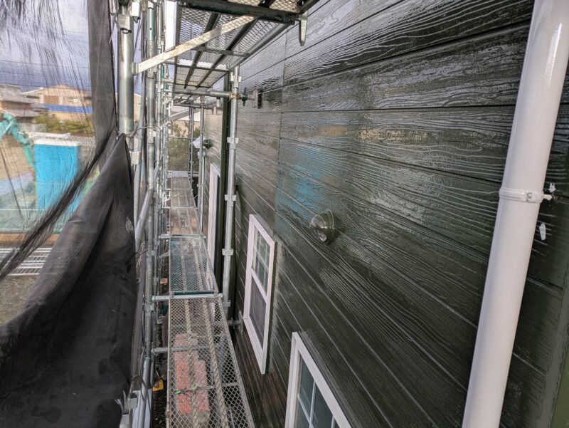 本日は昨日の続きで外壁上塗り→養生撤去→白廻り塗装を行いました。
