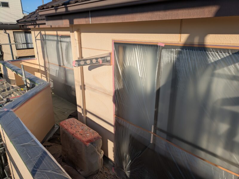 I様邸の方も養生→外壁下塗り→軒天→外壁中塗り→破風、鼻隠し等の塗装です。