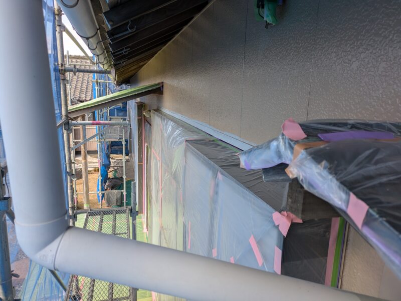 本日は昨日に引き続きビニール養生を少し行い、外壁のシーラー塗装、軒天塗装の途中で作業は終了です。