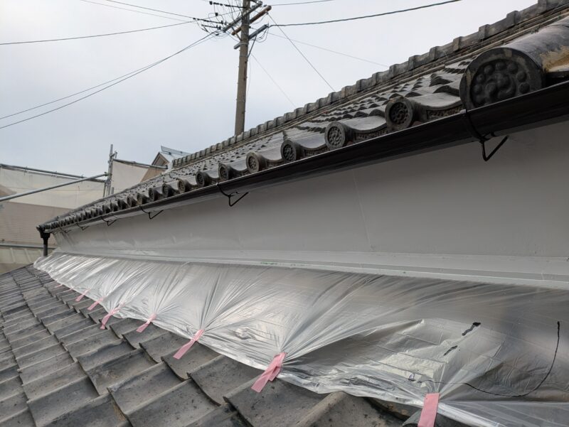 本日は蔵の鼻隠し・軒樋を塗装後に母屋の外壁上塗りを行いました。