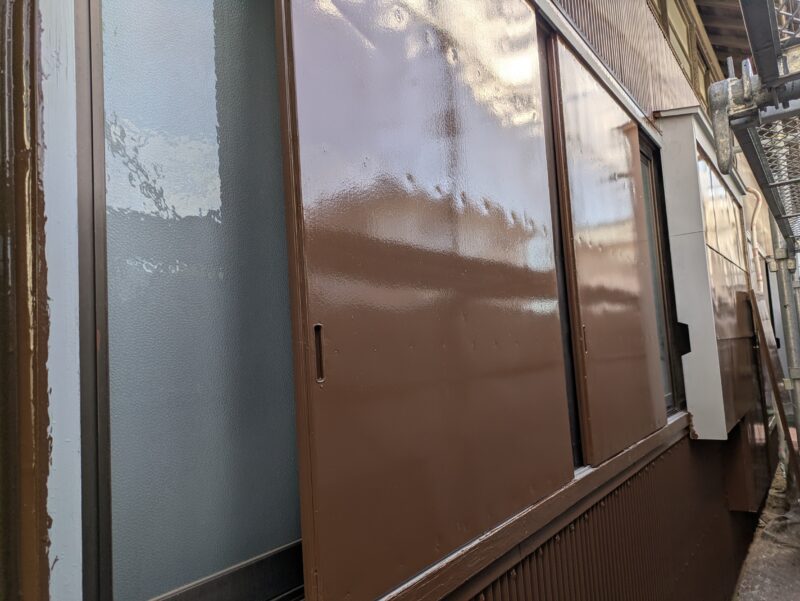 本日は外壁トタン上塗り、雨戸上塗り、玄関天井、壁、チョコ廻りと目白押しでした。